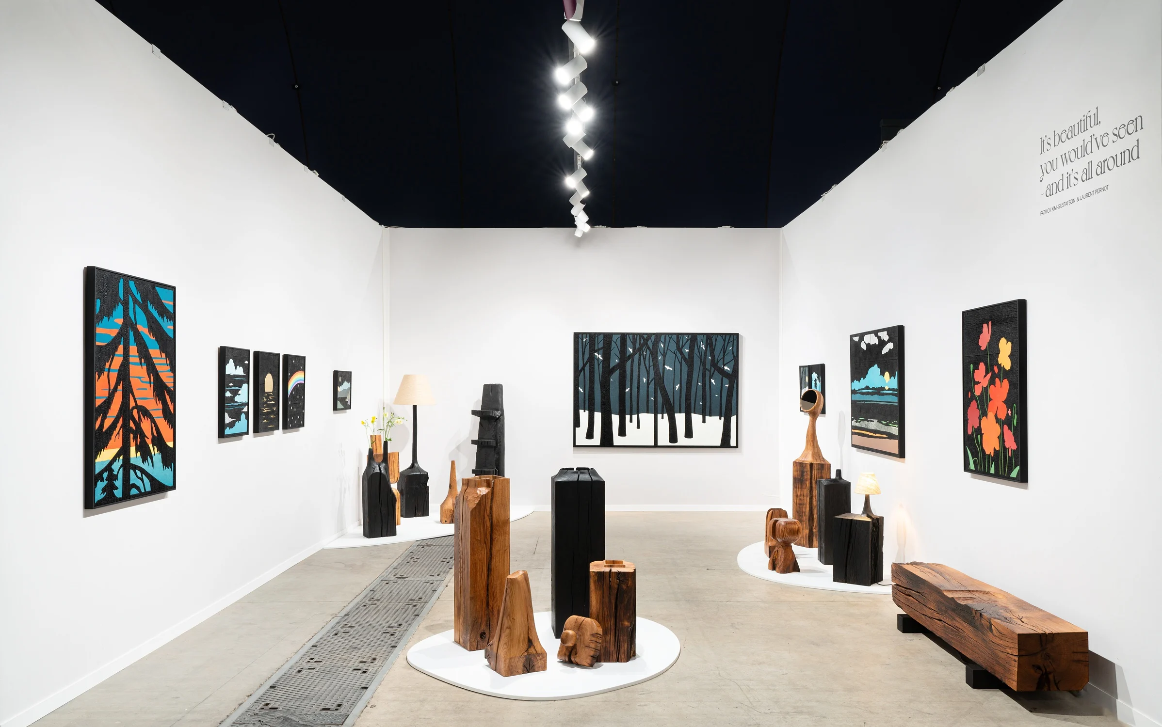 Avec une nouvelle série de paysages en marqueterie de bois et de marbre de Laurent Pernot, accompagnée par un ensemble des meubles sculpturaux et d’objets d’arts de Kim Gustafson, les œuvres exposées s’unissent dans leur approches respectives du principe de « vérité de la nature des matériaux ». Cette valeur – selon laquelle les matériaux naturels ont leurs propres lois et énergies qui agissent sur nos sens – a été défendue par William Morris, figure de proue du mouvement britannique des Arts & Crafts qui a émergé de l’industrialisation rampante de l’ère victorienne et a vivement critiqué son aliénation des gens, dans les rythmes organiques de leur temps, de leur travail et des matériaux qui avaient jusqu’alors façonné leur vie. It’s beautiful, you would’ve seen – and it’s all around adopte une position similaire, au milieu d’un important changement de temporalité, de travail et de relation à la matérialité induit par la montée de la technologie. À travers leur utilisation unique du chêne, Kim-Gustafson et Pernot présentent des œuvres qui contestent l’immédiateté croissante de notre époque et s’engagent avec des notions de temps profond telles qu’elles sont imprégnées dans le bois et la pierre, évoquant la cyclicité éternelle de la nature, des saisons et de la matière.